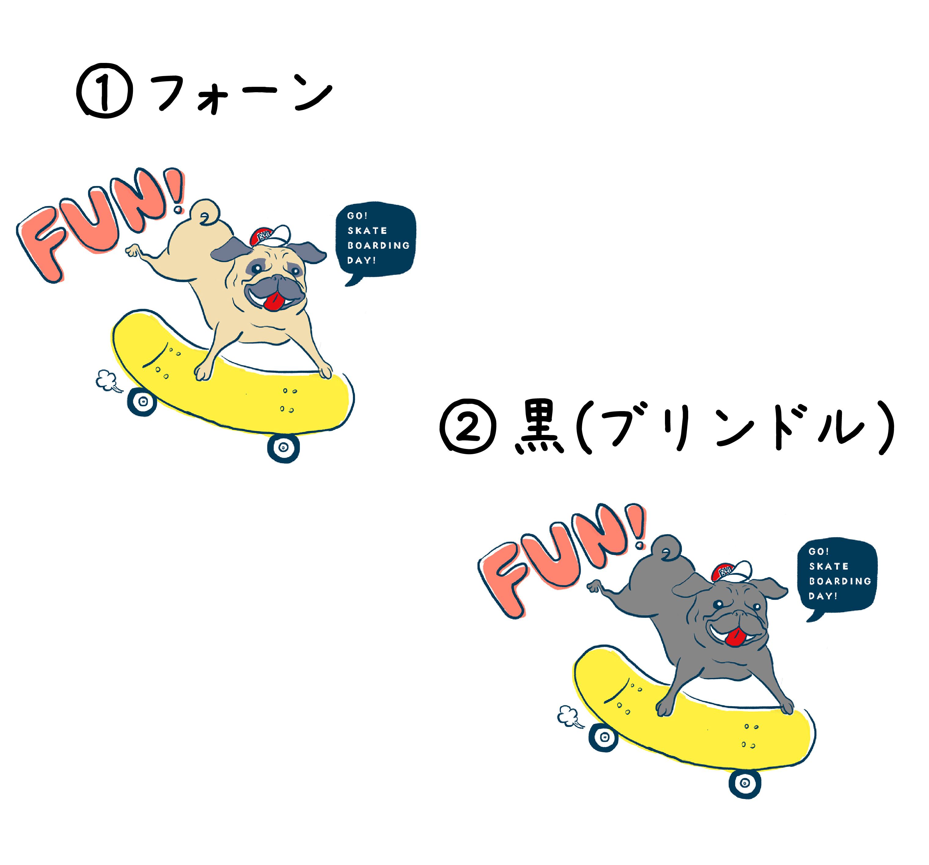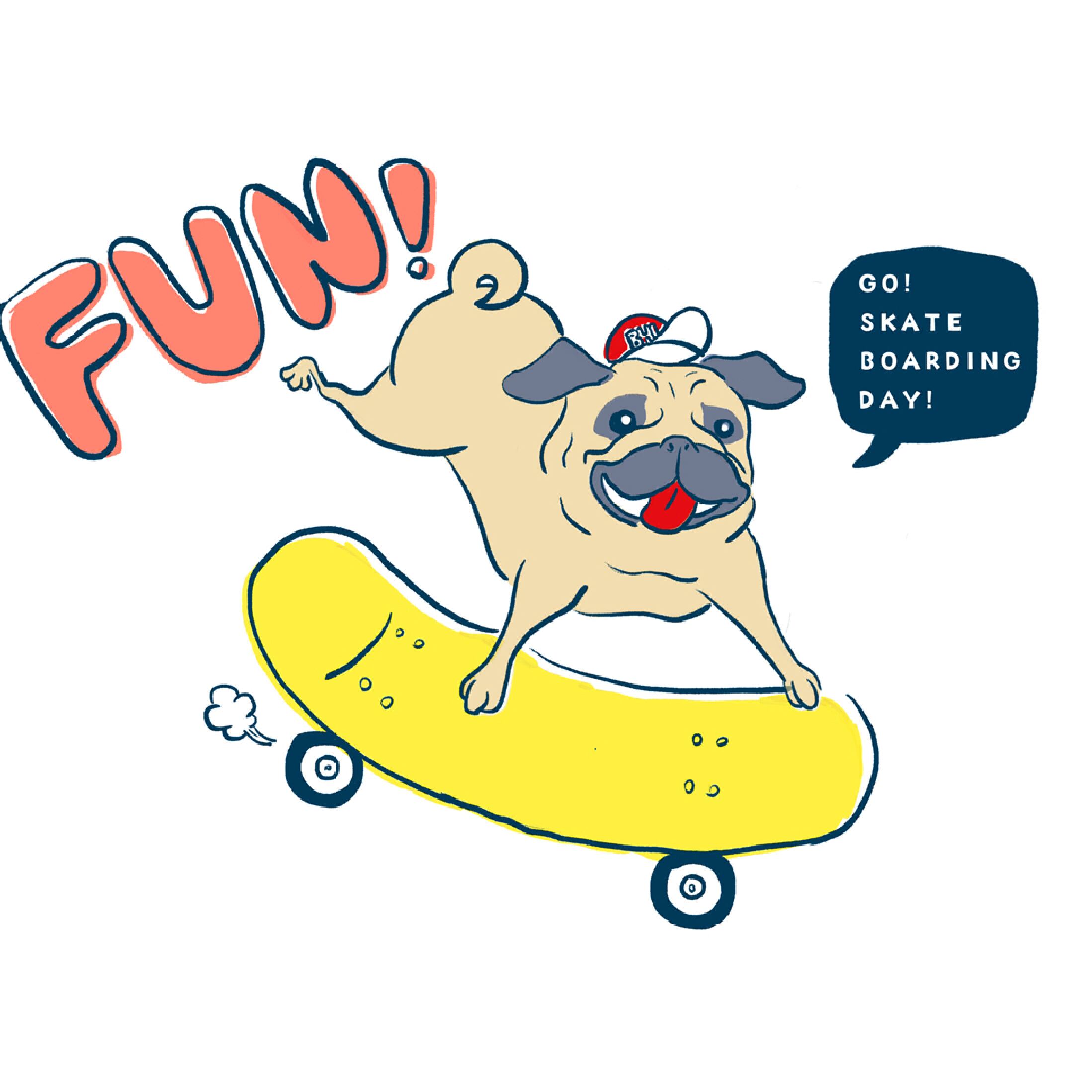 パグが楽しそうにスケボーしているイラストが入ったパーカーです♪